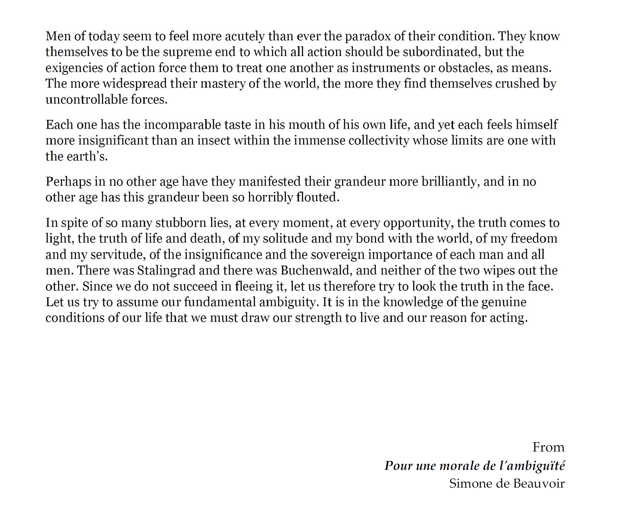 The piece is based on the book with the same title by the French philosopher Simone de Beauvoir. It explores the ambiguity of perception of our behaviors and reasons for acting.