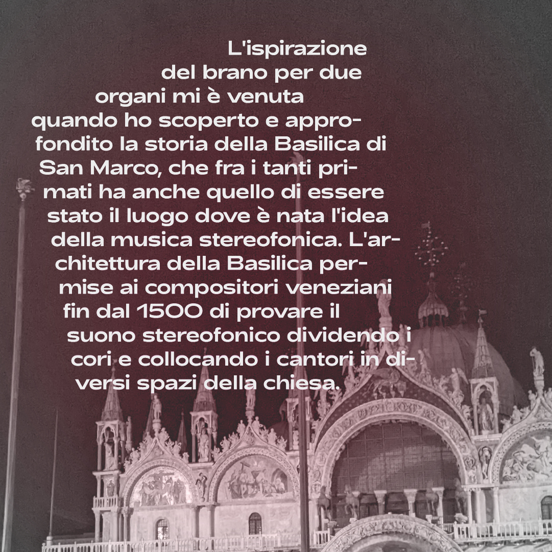 The inspiration for the piece for two organs occurred to me when I discovered and delved into the history of St Mark’s Basilica, which among its many primacies also has that of having been the place where the idea of stereophonic music was born. The architecture of the Basilica allowed Venetian composers as early as 1500 to try out stereophonic sound by dividing the choirs and placing the singers in different spaces of the church. The piece for two organs was written strictly for the organs of the Concert Hall of Palazzo Pisani in Venice. The left organ makes no use of the pedalboard and has only one keyboard.