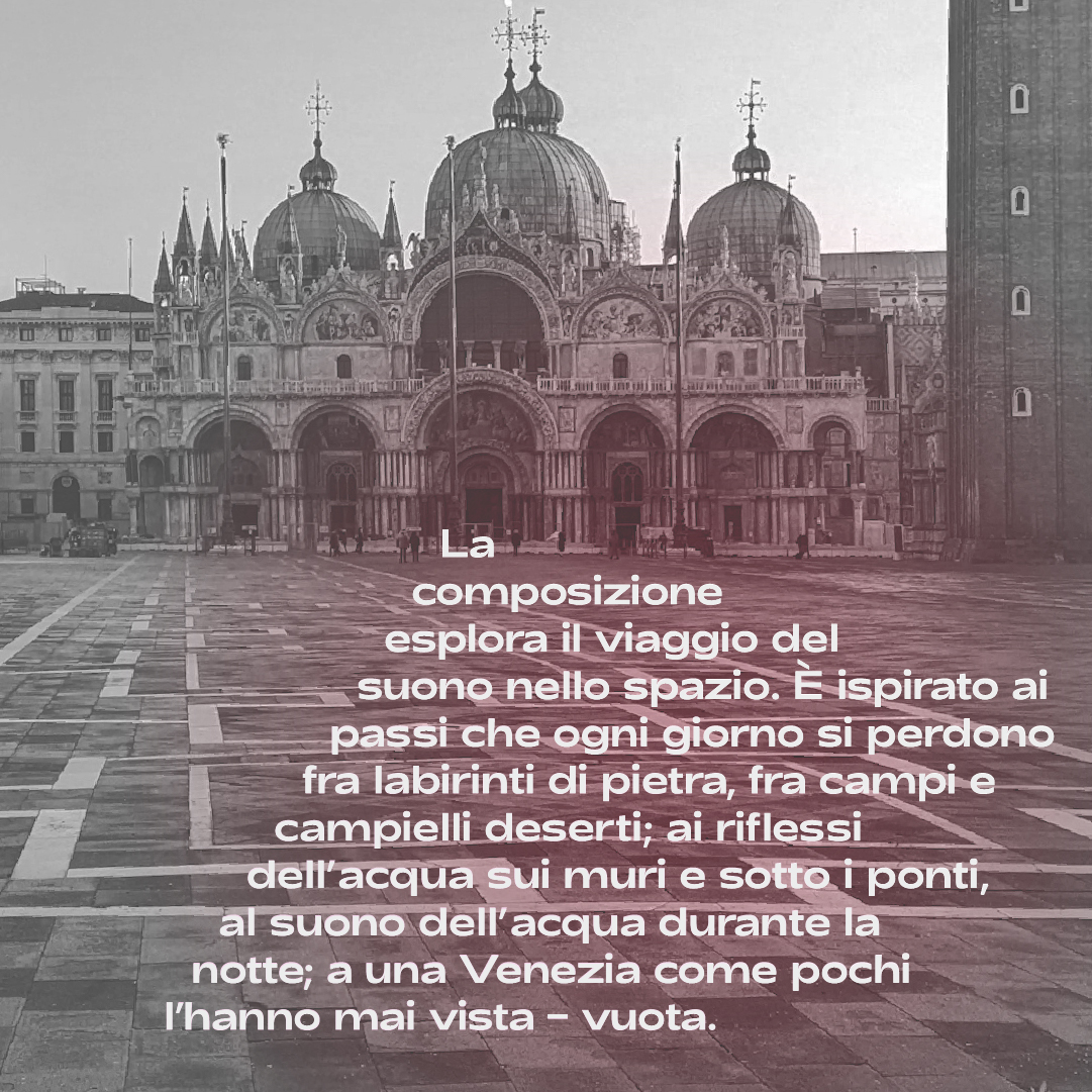 The piece explores the journey of sound through space. It is inspired by the footsteps that every day get lost among stone labyrinths, deserted campi and campielli; by the reflections of water on walls and under bridges, by the sound of water at night; by a Venice as few have ever seen it – empty.